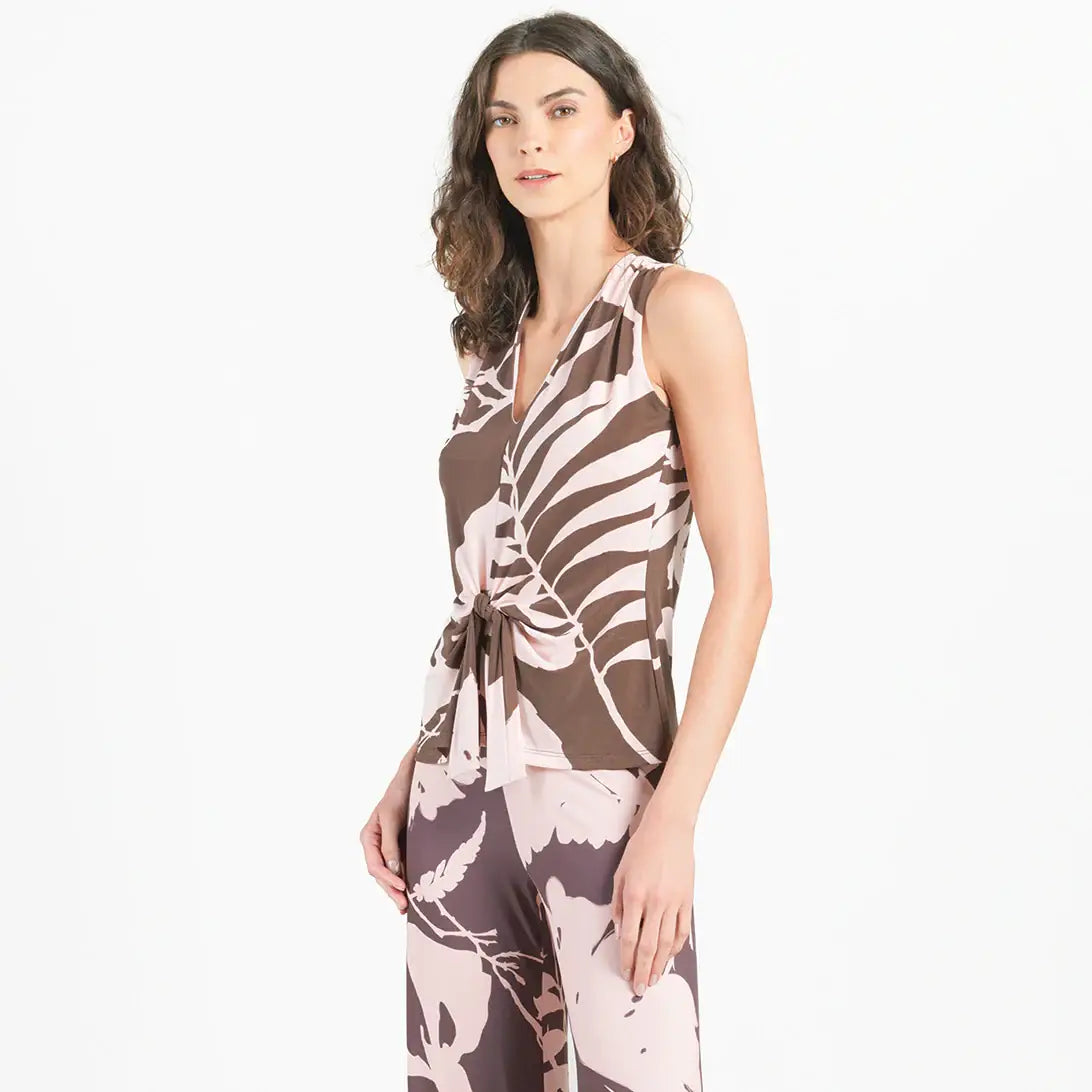 A style so graceful and captivating, it'll have everyone asking where you got your Floral Stem V-Neck Sleeveless Center Front Tie Top from! This flattering sleeveless top features a classic v-neckline, pleated shoulder seam, a vertical neck-to-hem center seam, and a front-center waist tie that creates a beautiful draped effect that accentuates your natural figure.