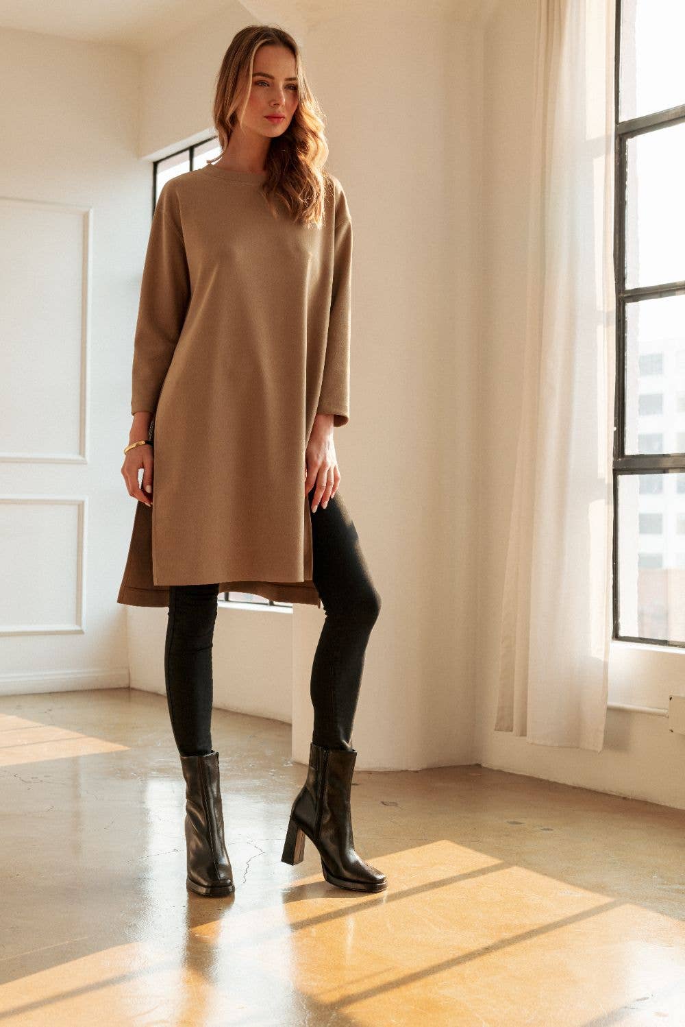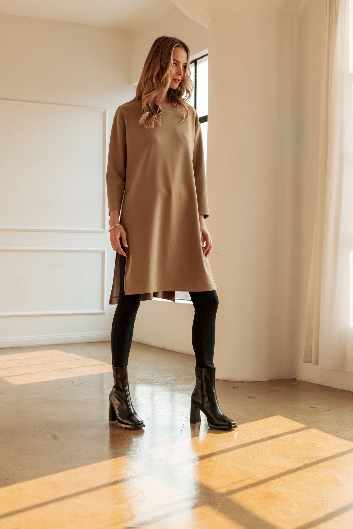 The Kenna long tunic Top. A minimalistic and chic long tunic top made with high quality stretch crepe knit. Long sleeve, round neck. Two high slits on both sides.