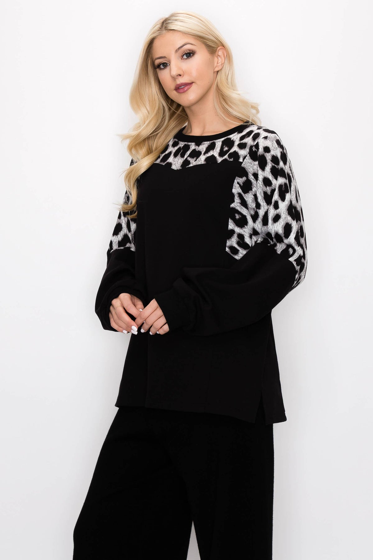 The Reese top. Made with high quality pointe rayon knit. Mixed with animal print in the shoulders & sleeves. So soft and comfy. Round neck and long sleeves. Easy relax fit. Perfect everyday wear.